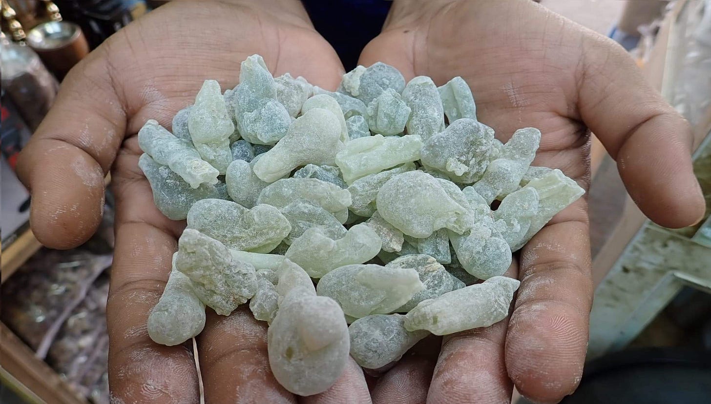 這位朋友的收藏都是極品,例如綠到發藍的乳香,很大塊(臭臭沒什麼味道的)龍涎香本人,問他乳香要去哪裡買?他搔搔頭說:喔…我不知道欸,每一年採收,都會有人送到家裡來,你看:這是某某部落的、那是某某部落的,你要去看乳香嗎?我們明年可以飛去阿曼。